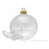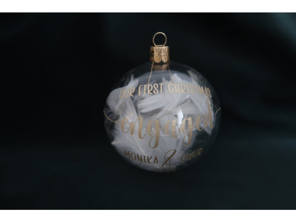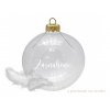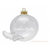 Priehľadná sklenená vianočná guľa krásne odráža svetielka stromčeka. Pripomeňte si ňou špeciálne udalosti: prvé Vianoce ako snúbenci, manželia, starí rodičia alebo prvé sviatky dieťatka. Priemer gule je 8 cm. Guľa s vlastným textom alebo menom na želanie v zlatej farbe písma. Obsahuje biele pierka vo vnútri.